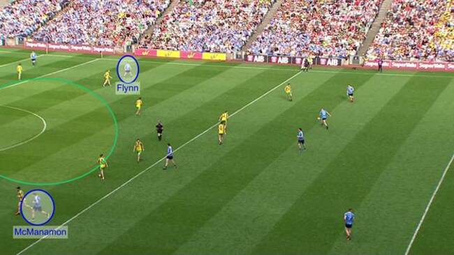Both Flynn and McManamon were on the Dublin ’45 when the ball broke down. McManamon made an initial carry down the right wing, but he is not too worried about the ball, he is simply just trying to make the pitch as wide as possible.