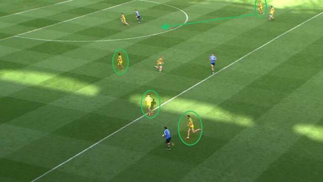 Then late in the first half there seems to be a communication breakdown and four players push up with the rest dropping off. As Cluxton easily clears the line of four, it leaves acres of space for Dublin.
