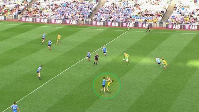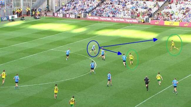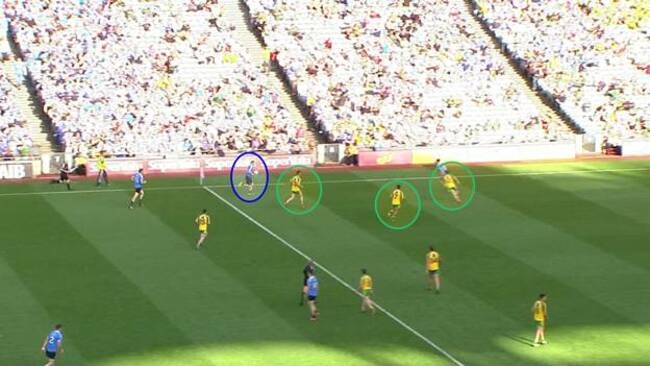 In this example Donegal look well set up. MacNiallais, McHugh and McGlynn are between McManamon and the ball. Lacey is on his way to act as cover.