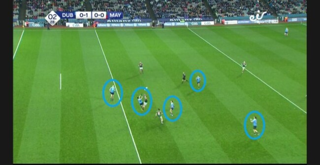 Dublin’s second point came from a Mayo kickout. Firstly this is a Mayo kickout, so they should be controlling the game but the ball gets kicked and Mayo are completely outnumbered.