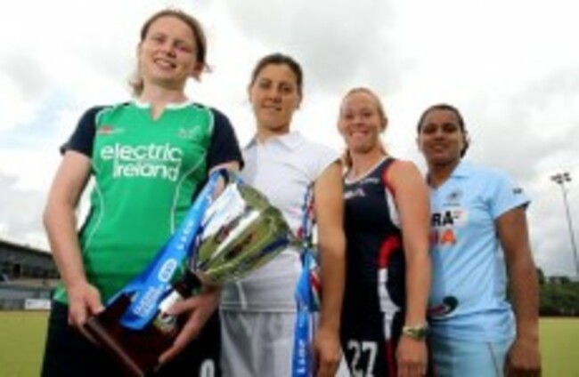 Team captains at the launch of the ESB Electric Ireland FIH Champions Challenge in UCD were Alex Speers (Ireland), Azerbaijan's Khatira Aliyeva, Lauren Crandall of the USA and India's Saba Anjum. INPHO/Lorraine O'Sullivan