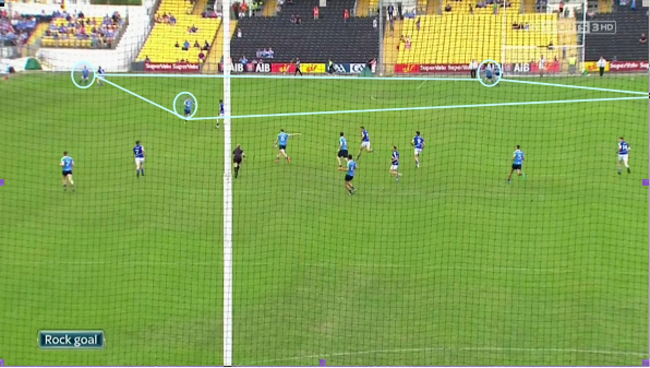 When Rock gets his hands on the ball he is almost on the end line. It is a 4 v 3 in favour of Dublin so the odds are reasonably high that Dublin would get a goal opportunity from here but Laois made it too easy.