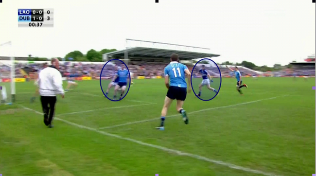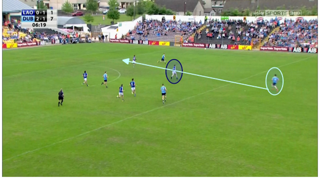 Even before Kilkenny has the ball in his hands you can see McManamon puts his head down and takes off towards the far wing; all the time making sure they have width in their game. You can also see Dublin have a man right in this near corner which has dragged the Laois defender out of the middle.