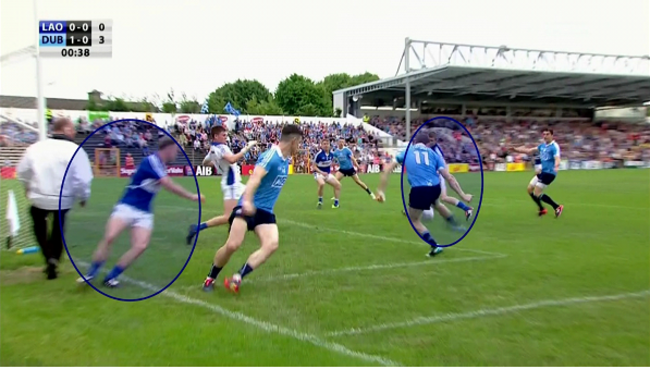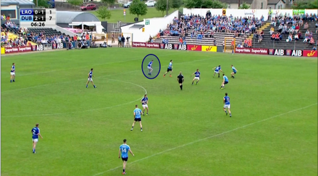 The move comes from a Dublin turnover and an excellent, quick Laois attack. But let’s take it back to the Dublin possession. The ball has come down the right wing and is in the hands of Kilkenny. You can see McCarthy highlighted. Keep an eye on where he ends up as the move progresses.
