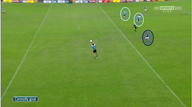 Instead, full-back O’Connor gets a little pre-occupied with McCarthy and in the end doesn’t really do either job of closing McCarthy down (which is futile in this case) or dropping off on Connolly. As with the first goal, Laois turn a favourable Dublin position into a gimme of a goal.