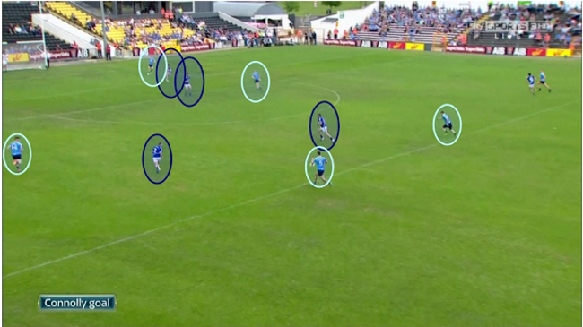 The priority here should be to get themselves between the ball and the goal. At the very least they should have forced Dublin into another pass before they shot. Instead, Connolly receives a pass and has a free passage towards goal and neatly slots the ball home.