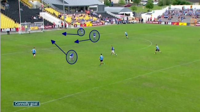 In this particular move Dublin could have easily exploited the middle. They have two runners (Byrne and Small) coming at pace from deep to exploit any soft centre.