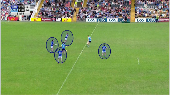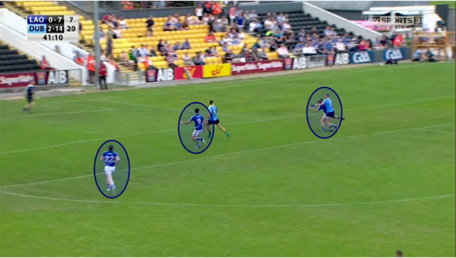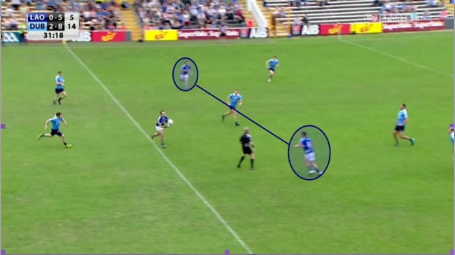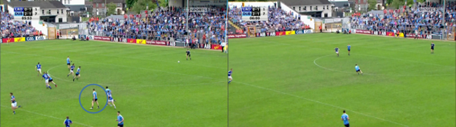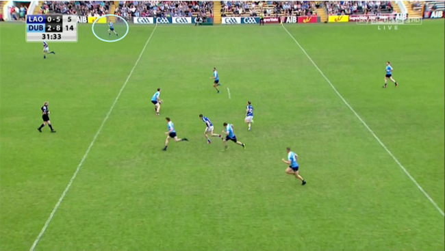 Contrast the width Dublin showed in the above example with Laois’ attacking shape. Brendan Quigley fetched a magnificent high ball, hopped the ball once and soloed five times to end up in the centre of the pitch surrounded by three of his own men.