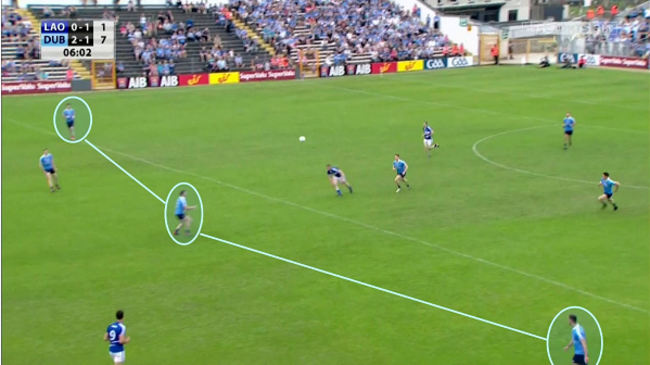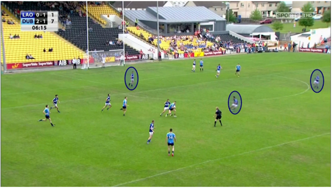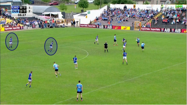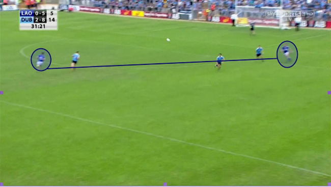 Their width throughout the game was really impressive. Throughout the game they were able to stretch Laois, often switching the play to try and prod open a packed defence. There was a great example of this just six minutes in.