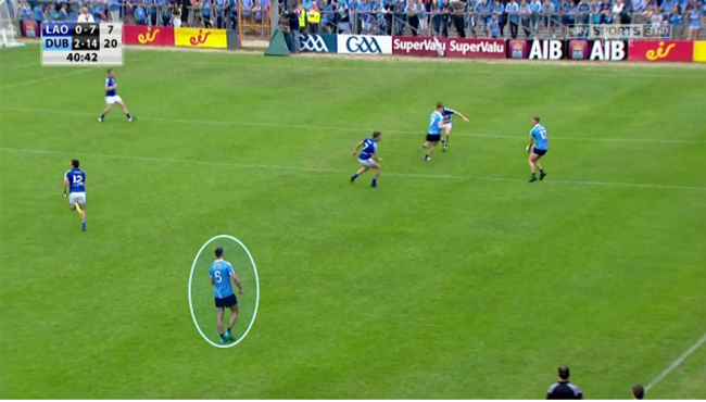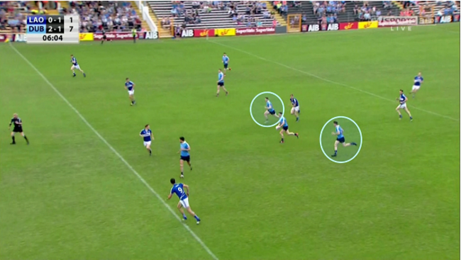 Laois had the numbers but Dublin’s movement off the ball and their ability to switch from wing to wing has left two Laois sweepers effectively in no man’s land doing the same job.