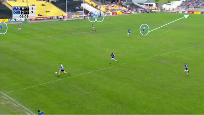 There are nine players in and around the D, yet just a few seconds later the camera has hardly any player in shot except John Small — who ironically has barely moved, but everyone else has created the space. From that point, Dublin are looking to stretch Laois with their shape.