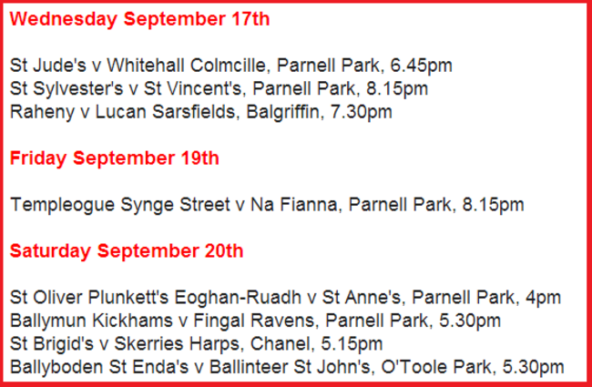 There will be three matches on Wednesday September 17th with Kevin McMananmon, Cormac Costello and Diarmuid Connolly all set to be in action for their clubs.