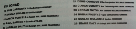 WESTMEATH: Gary Connaughton (Tubberclair); Mark McCallion (Garrycastle), Kieran Gavin (Mullingar Shamrocks), Kevin Maguire (Caulry); Doron Harte (Garrycastle),Paul Sharry (St Loman’s), John Gaffey (Garrycastle); David Duffy (Shandonagh), John Heslin (St Loman’s); Kieran Martin (Maryland), Callum McCormack (Maryland), James Dolan (Garrycastle); Ger Egan (Tyrrellspass), Denis Glennon (Tyrrellspass), Dessie Dolan (Garrycastle).