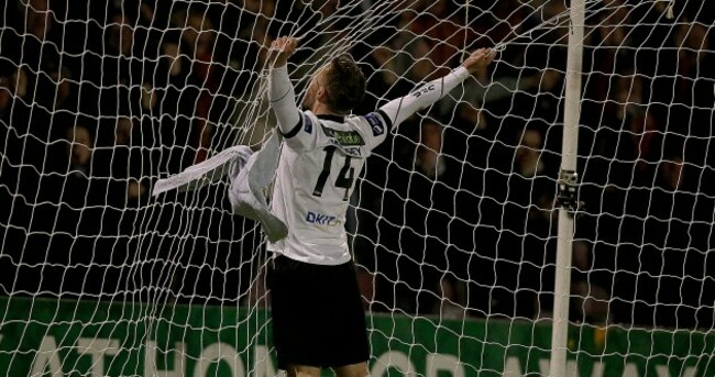 Seven minutes later, Dundalk’s goal was living a charmed life when a corner headed down by Evans to Anto Murphy who fired it off the bar before his centre-half partner Derek Prendergast’s overhead kick whizzed past the goal face and wide.