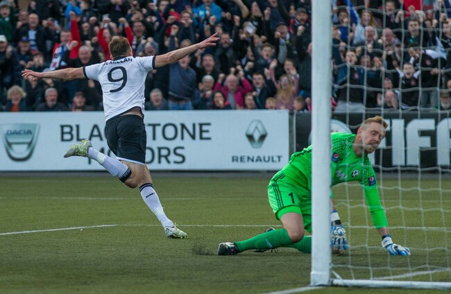 The opener came on 65 minutes. Sean Gannon did well to emerge from a tussle with the ball midway inside the Dundalk half. He broke forward and released McEleney down the right. He crossed infield for McMillan. The striker had a long time to watch the ball coming but he cooly dispatched a first time volley into the net.