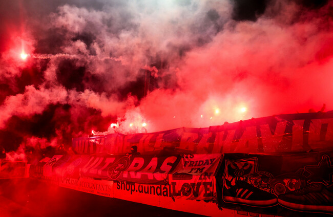 Flares from Drogheda’s away end were thrown on to the pitch before kick-off, as well as in the aftermath of Drogs’ late equalising goal. Around 50 scorch marks were left on the brand new surface, while a 12-year-old boy was also struck by a flare.