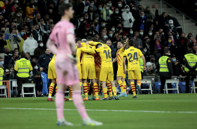 Barca celebrate Ferran Torres' goal as Real Madrid 'keeper Thibaut Courtois looks on in dismay. DPA/PA Images