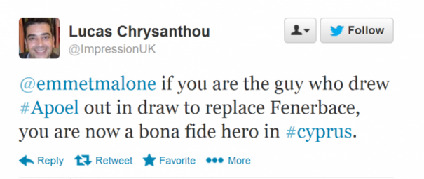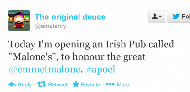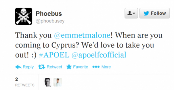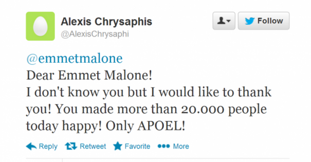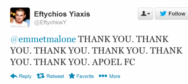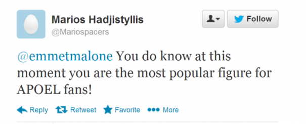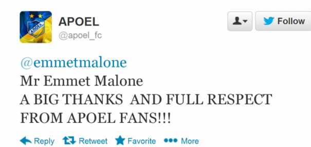 IRISH TIMES SPORTS journalist Emmet Malone has today received an abundance of complimentary tweets from APOEL Nicosia fans.