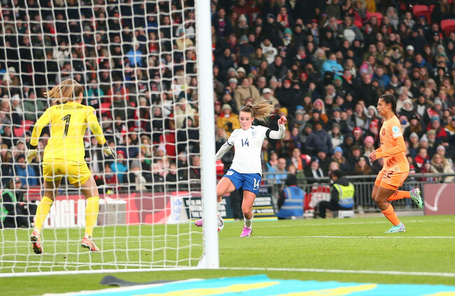 England’s attempts to hit back before the interval saw Kelly drill wide, a James shot gathered by Van Domselaar and Bronze miss with a header.