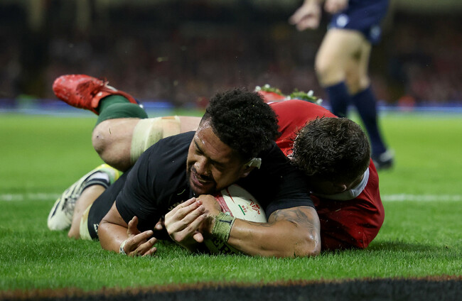 There was more of the same shortly after Wales strayed offside. Mo’unga kicked to the corner, the All Blacks rolled the line-out into midfield and proceded to batter the home defence until Taylor burrowed his way over for his second try.