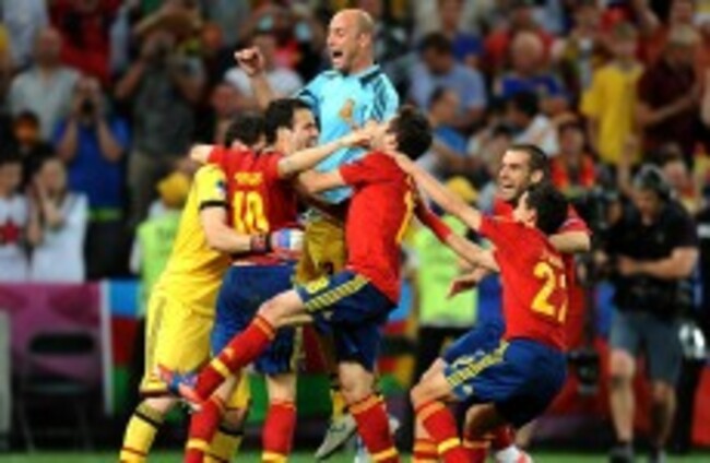 Spain's Francesc Fabregas (second left) celebrates with team-mates after scoring his penalty to send his team through to the final. Tony Marshall/EMPICS Sport