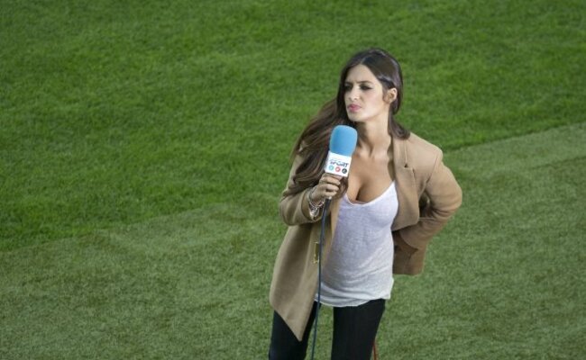 Spanish sports TV presenter Sara Carbonero stands on the pitch prior to the Euro 2012 soccer championship Group C match between Spain and Italy in Gdansk. (AP Photo/Gero Breloer)