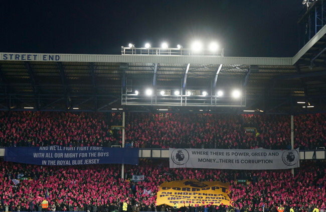 EVERTON FANS PROTESTED en masse against their Premier League points deduction before today’s home game against Manchester United.
