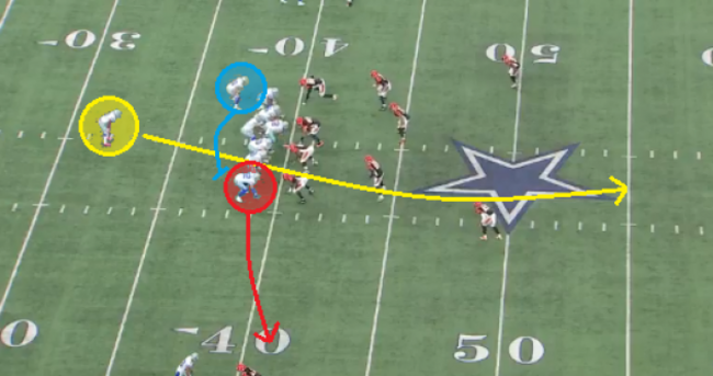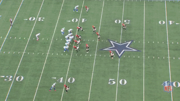 Before the snap, Swaim makes his way from the right of the Dallas offensive line to the left, causing a shift in the defence that shows quarterback Dak Prescott that they are playing zone defence.