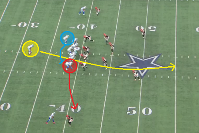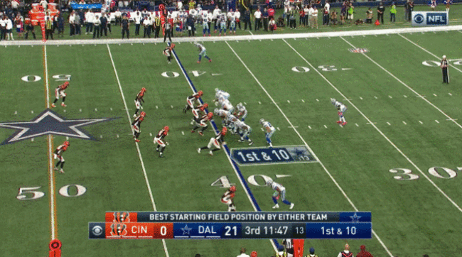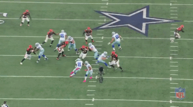 The veteran tight end may not have blocked anybody but, as you can see below, he occupied two defenders — Iloka and Burfict — either of whom could have easily made a tackle on Elliott had they not been preoccupied with #82.
