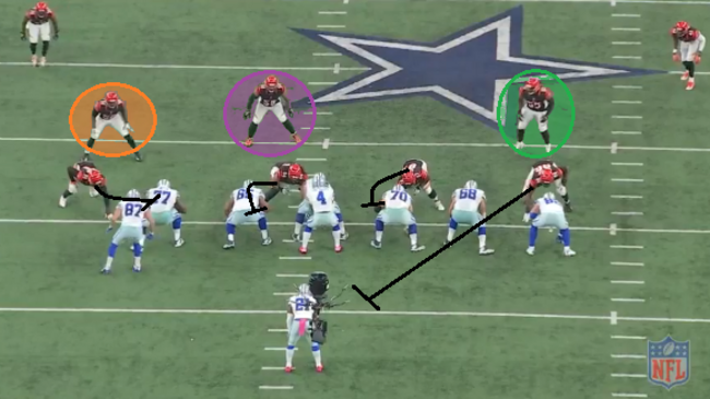 Up front, Cincinnati are in their base 4-3 formation with Karlos Dansby (orange), Rey Maualuga (purple) and Vontaze Burfict (green) the Sam (strong-side), Mike (middle) and Will (weak-side) linebackers respectively.