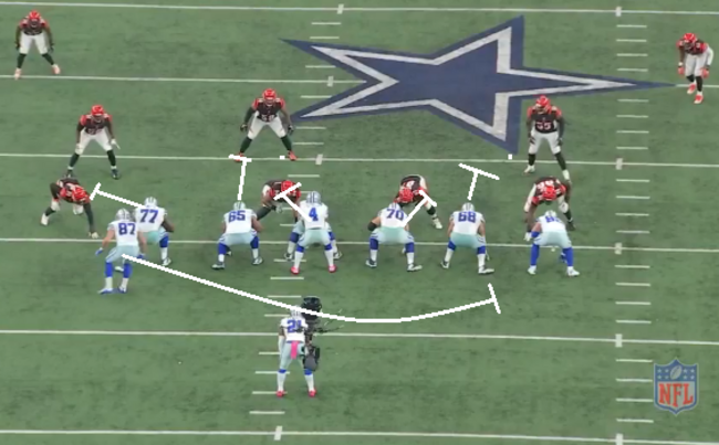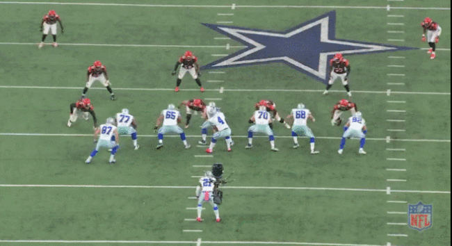 From left to right — Tyron Smith (#77), Ronald Leary (#65), Travis Frederick (#72) Zack Martin (#70) and Doug Free (#68) — they all execute their blocks perfectly.