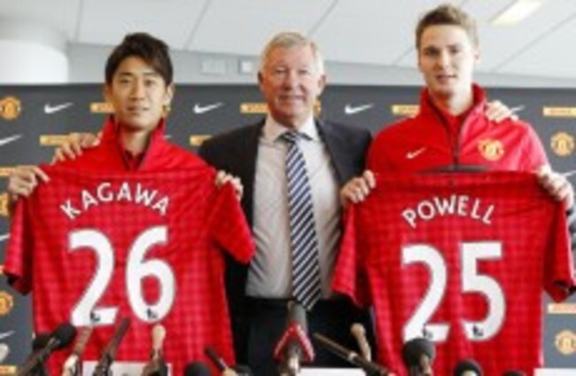 Japan international Shinja Kagawa, acquired from Borussia Dortmund, and former Crewe midfielder Nick Powell were presented to the media at Old Trafford today.