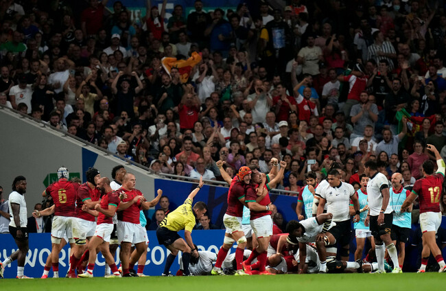 A late try from Rodrigo Marta has earned Portugal a famous World Cup win but Fiji are through to the quarter-finals at Australia's expense after picking up a losing bonus point #RWC2023#FIJvPOR