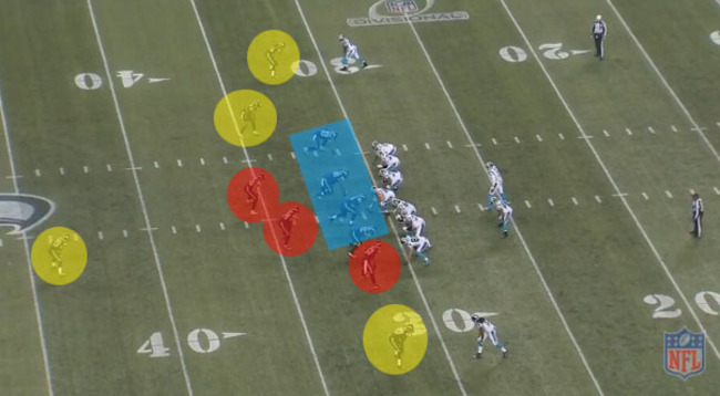The Seahawks lined up in their standard defence with three deep zone defenders, and four underneath. Here are the zones they wanted to cover: