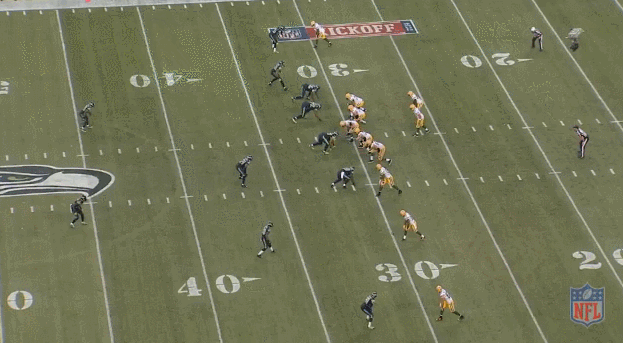 The tight end Andrew Quarless (green) occupies Bobby Wagner (#54) in the middle of the field before his route draws in Earl Thomas (#29) on the right.
