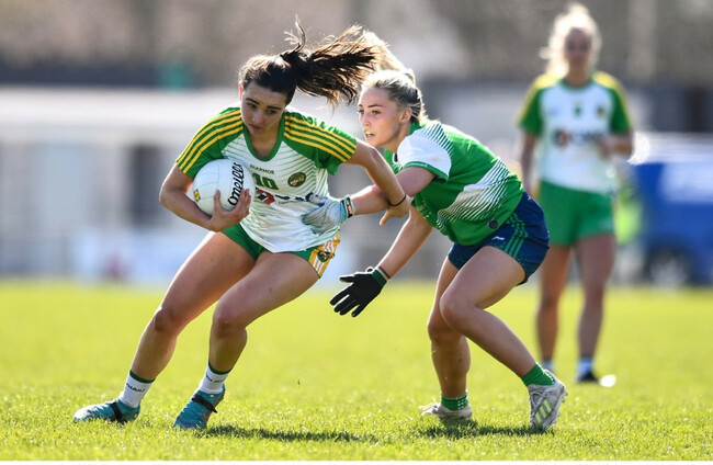 Fiona Dempsey of Offaly and Meadhbh MacNamara of Limerick during the Lidl Ladies Football National League Division 4 Final match between Limerick and Offaly at St Brendan's Park in Birr, Offaly. Photo by Ben McShane/Sportsfile