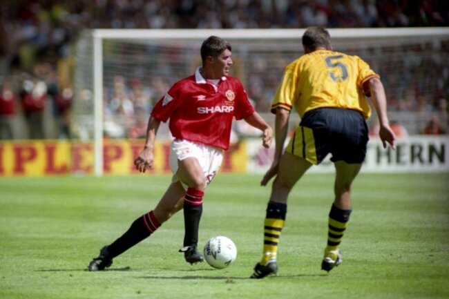 Roy Keane, on his United debut, takes on Andy Linighan of Arsenal. (PA Archive)