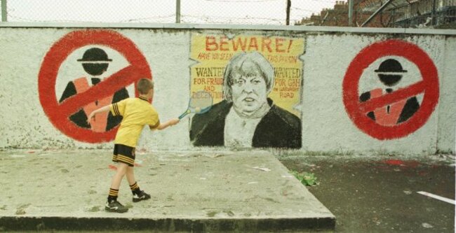 A Belfast youth plays tennis against a Mo Mowlam mural on the Nationalist Lower Ormeau Road. (Brian Little/PA)