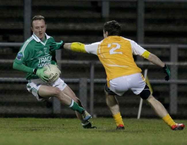 Antrim’s Kevin O’Boyle in action with Fermanagh’s Paul Ward