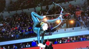 We don’t know much about the details. But during the halftime act, a female acrobat did a handstand and then shot an arrow with her feet. She then finished the routine with a mid-air split.