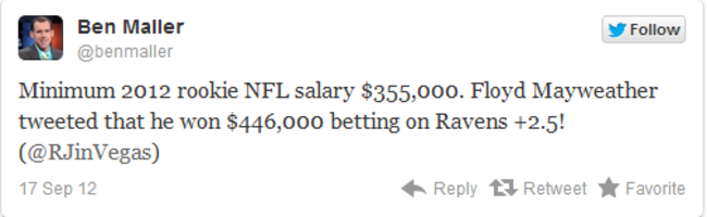 On Sunday, Mayweather placed a $446,000 bet on the Baltimore Ravens to cover a two-and-a-half point spread on the road against the Philadelphia Eagles. The Eagles defeated the Ravens 27-26, sealing the bet for Mayweather. It was only a small piece of Mayweather’s fortune, but still a hefty risk nonetheless.
