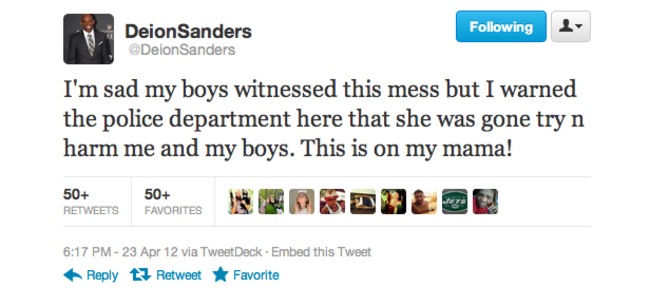 Former NFL star Deion Sanders live-tweeted an alleged assault by his wife last night
