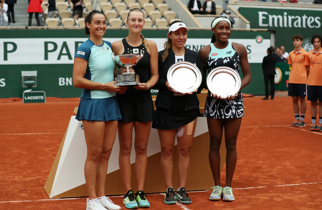 Caroline Garcia/Kristina Mladenovic of France and Jessica Pegula/Coco Gauff of the United States during the awarding ceremony. Xinhua News Agency/PA Images