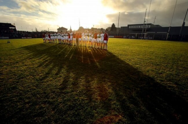 Portlaoise players stand together for the national anthem. (©INPHO/Cathal Noonan)