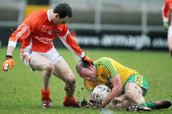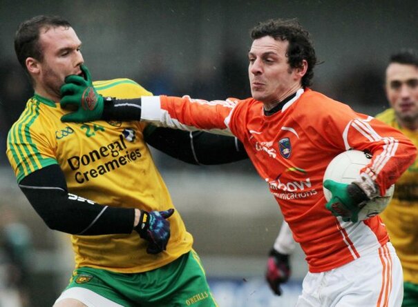 Armagh's Finian Moriarty with Donegal's Colm McFadden