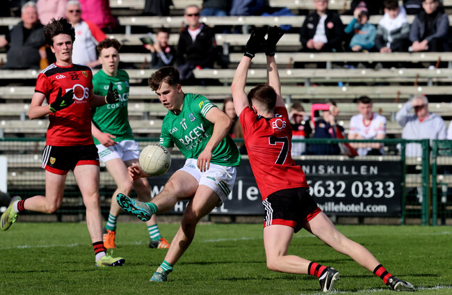 Taidgh O'Hanlon of Down attempts to block a shot by Fermanagh's Cian O'Brien during the preliminary round of the 2022 Electric Ireland Ulster MFC. Bryan Keane/INPHO