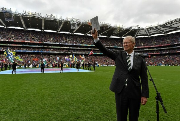 Micheal Ó Muircheartaigh acknowledges the crowd.