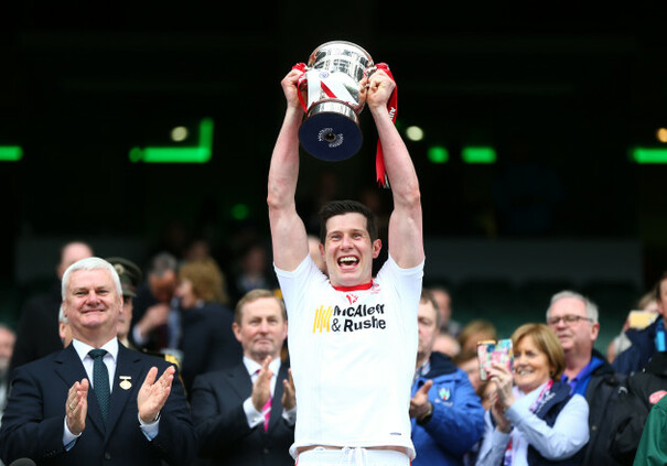 Sean Cavanagh and Mickey Harte celebrate after the Division 2 final.