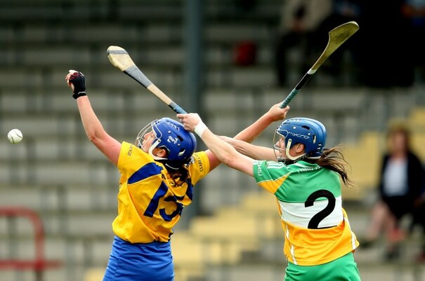 Claire McMahon and Fiona Stephens battle in Saturday's camogie action