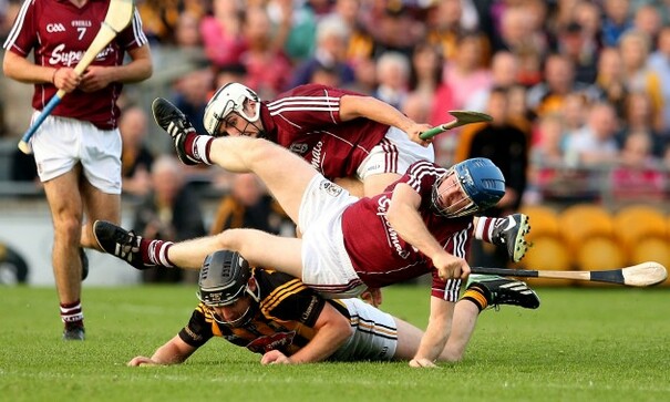 Damien Hayes and Daithi Burke tackle Kilkenny's Richie Hogan